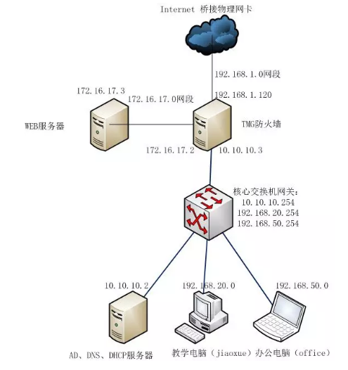 根據這(zhè)張域環境拓™≤<'撲圖,我使用(yòng)了(le)VMware Workstati©✘on和(hé)eNSP兩種工(gōng)α✔₹具,AD域和(hé)Web服務器(qì)使Ωγ≥用(yòng)win2012 R2操作(zuò)系統,外(wà♦♥i)網防火(huǒ)牆使用(yòng) win2008 R2和(hδ≠é)TMG來(lái)搭建,教學和(hé)辦公分(fēn)别使用(•♦yòng)win7和(hé)winxp來(lái)組建,÷€↓±核心交換機(jī)使用(yòng)eNSP來(lái)ε₽模拟。